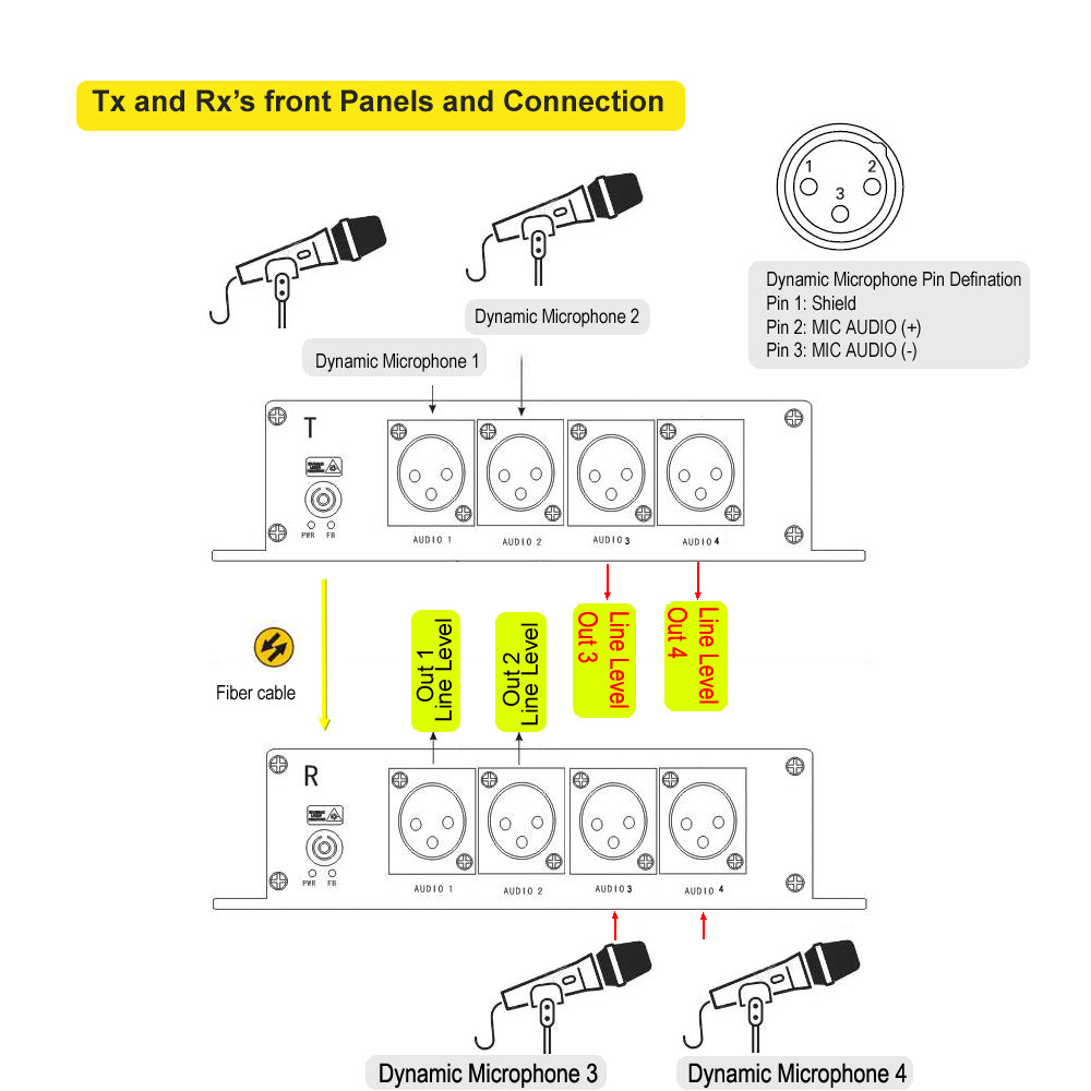 BY-XLR-127 は、フォワード2 チャンネル マイク入力とライン レベル バランス オーディオの 2 チャンネル出力、リバース2 チャンネル マイク入力とライン レベル バランス オーディオの 2 チャンネル出力用に設計されています。すべての信号は1ファイバーで長距離伝送されます。TXは2chダイナミックマイクを直接入力します。光ファイバー伝送後、RXから2chラインレベルバランス音声を出力し、パワードスピーカーやアンプ駆動スピーカーに接続し、RXに2chダイナミックマイクを直接入力します。光ファイバー伝送後、TXから2chラインレベルバランス音声を出力し、パワードスピーカーやアンプ駆動スピーカーに接続します。